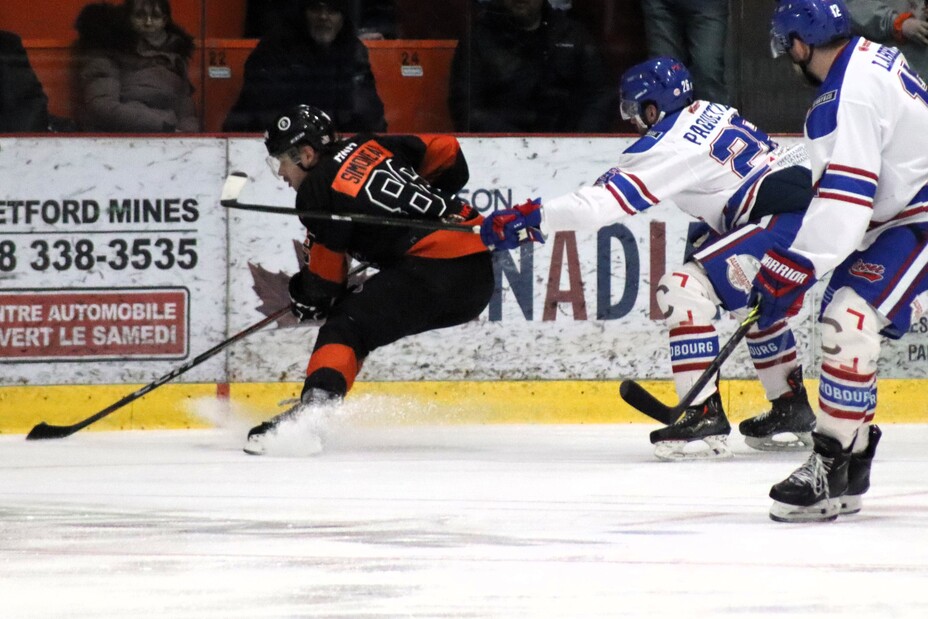 Alex Simoneau, première étoile du match avec deux buts. (Photo : Sandra Giroux-Poulin) L’Assurancia de Thetford n’a pas déçu ses partisans lors du dernier match local de la saison régulière vendredi.