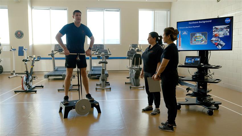 Il est l’une des quatre personnes à avoir testé la roue d’inertie qui a été montée à bord de la capsule Orion, afin que les astronautes puissent garder la forme dans l’espace. Cette roue a été testée en apesanteur lors de vols paraboliques à l’aéroport de St-Hubert. « Les premiers vols paraboliques ont été conduits en 2024, pour tester la roue d’inertie en microgravité. Ça n’avait jamais été fait. La roue d’inertie a été créée en 1990 pour voler dans l’espace, mais n’avait jamais été testée dans ces conditions! C’est un outil qui est attaché à la capsule. En 2025 en octobre, on a fait d’autres vols pour simuler des entraînements sur la structure, et tester le volet ingénierie ». La roue d’inertie permet aux astronautes de faire toute une suite d’exercices cardiovasculaires. Dans l’espace, le seul exercice prescrit était celui du rameau, du « squat deadlift », et de biceps. Ils sont attachés par les pieds.